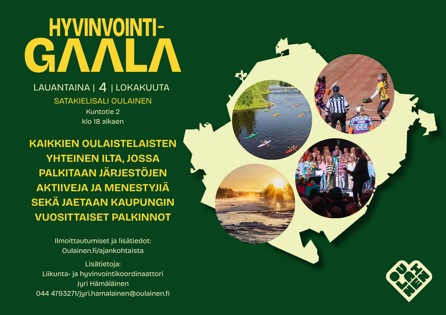 Hyvinvointigaala on kaikkien oulaistelaisten yhteinen ilta, jossa palkitaan järjestöjen aktiiveja ja menestyjiä sekä jaetaan kaupungin vuosittaiset palkinnot. Tapahtuma on avoin kaikille kuntalaisillemme.