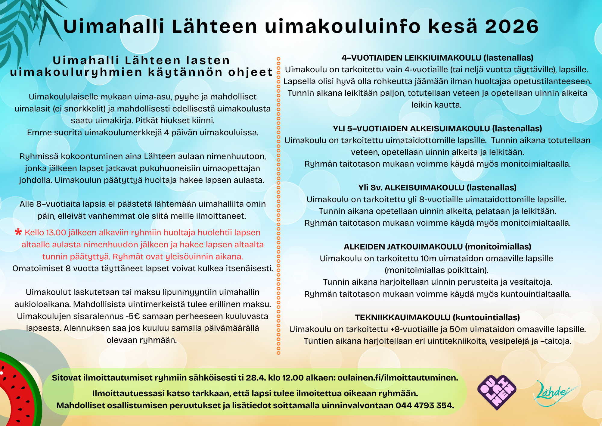 Lue huolella uimakouluinfo ja ohjeet ennen ilmoittautumista. TÄSTÄ LINKISTÄ.