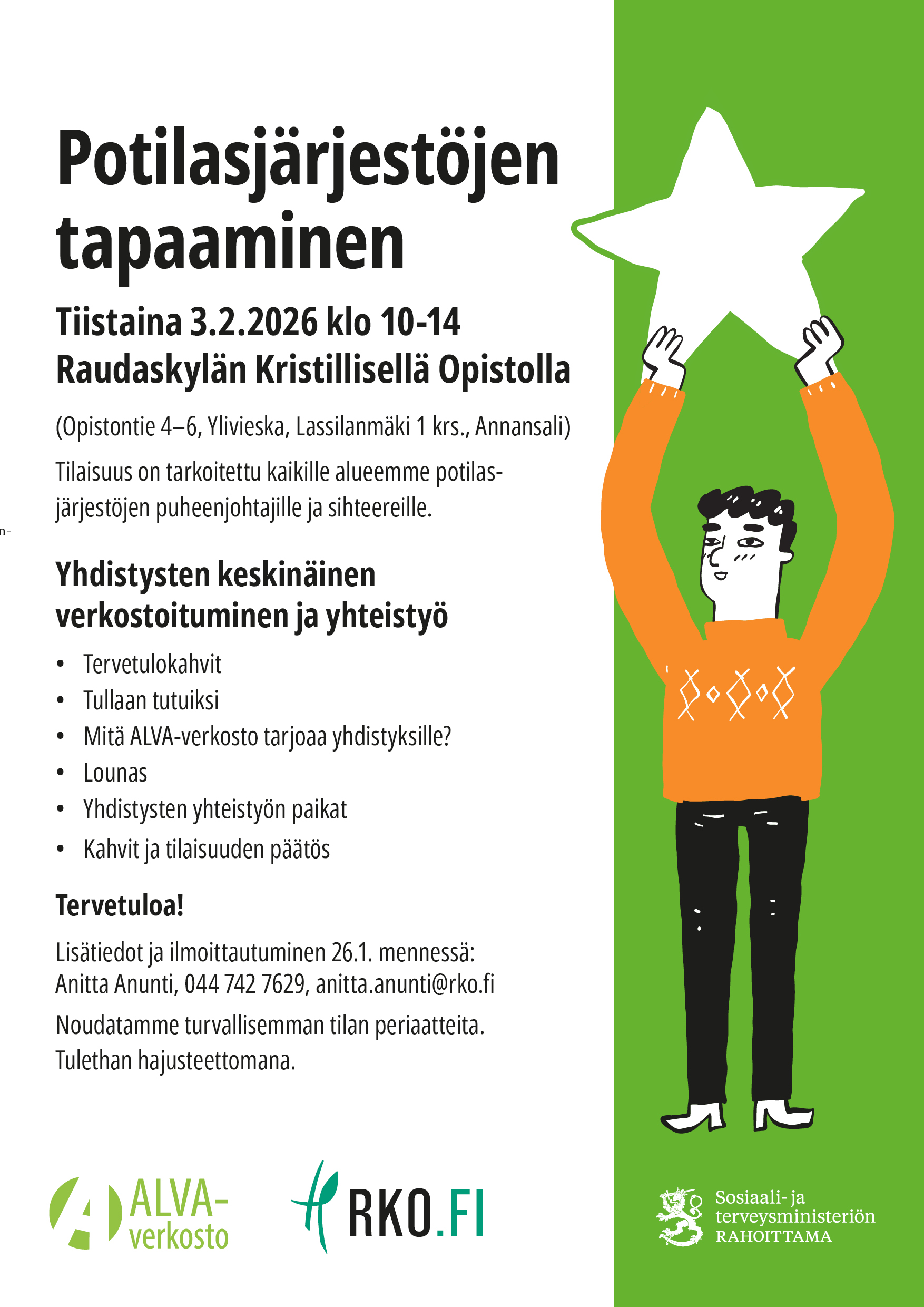 Tilaisuus on tarkoitettu kaikille alueemme potilasjärjestöjen puheenjohtajille ja sihteereille. Tavoitteena on yhdistysten keskinäinen verkostoituminen ja yhteistyö.