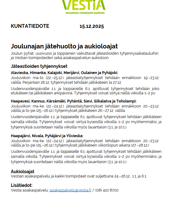 Vestian kuntatiedote: Joulunajan jätehuolto