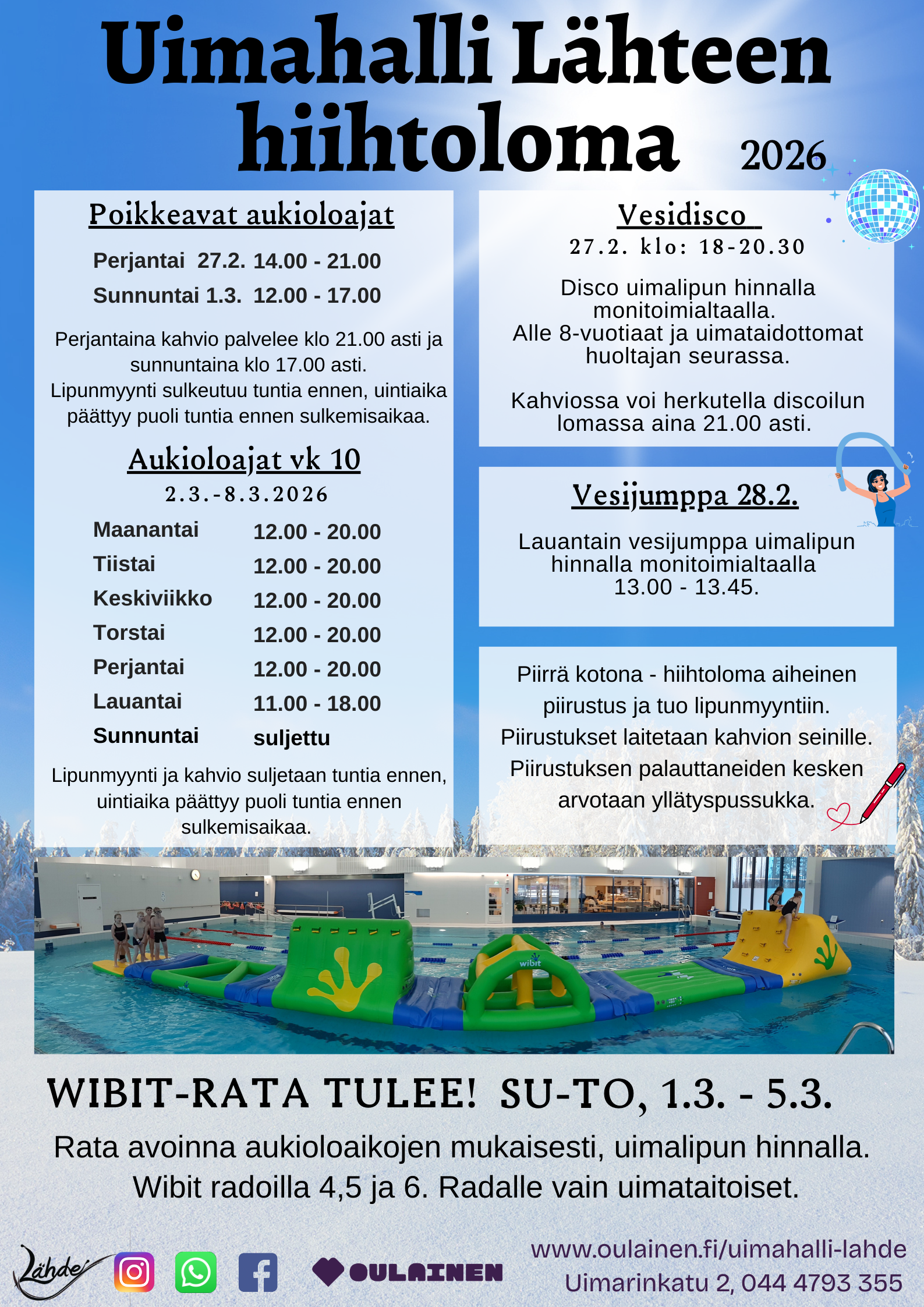 Lähteen kevään 2026 sunnuntaiaukioloajat 1.3. 22.3. ja 19.4. klo 12.00-17.00. Kahvio palvelee 17.00 asti. Lipunmyynti sulkeutuu tuntia ennen. Uintiaika päättyy puoli tuntia ennen sulkemisaikaa.