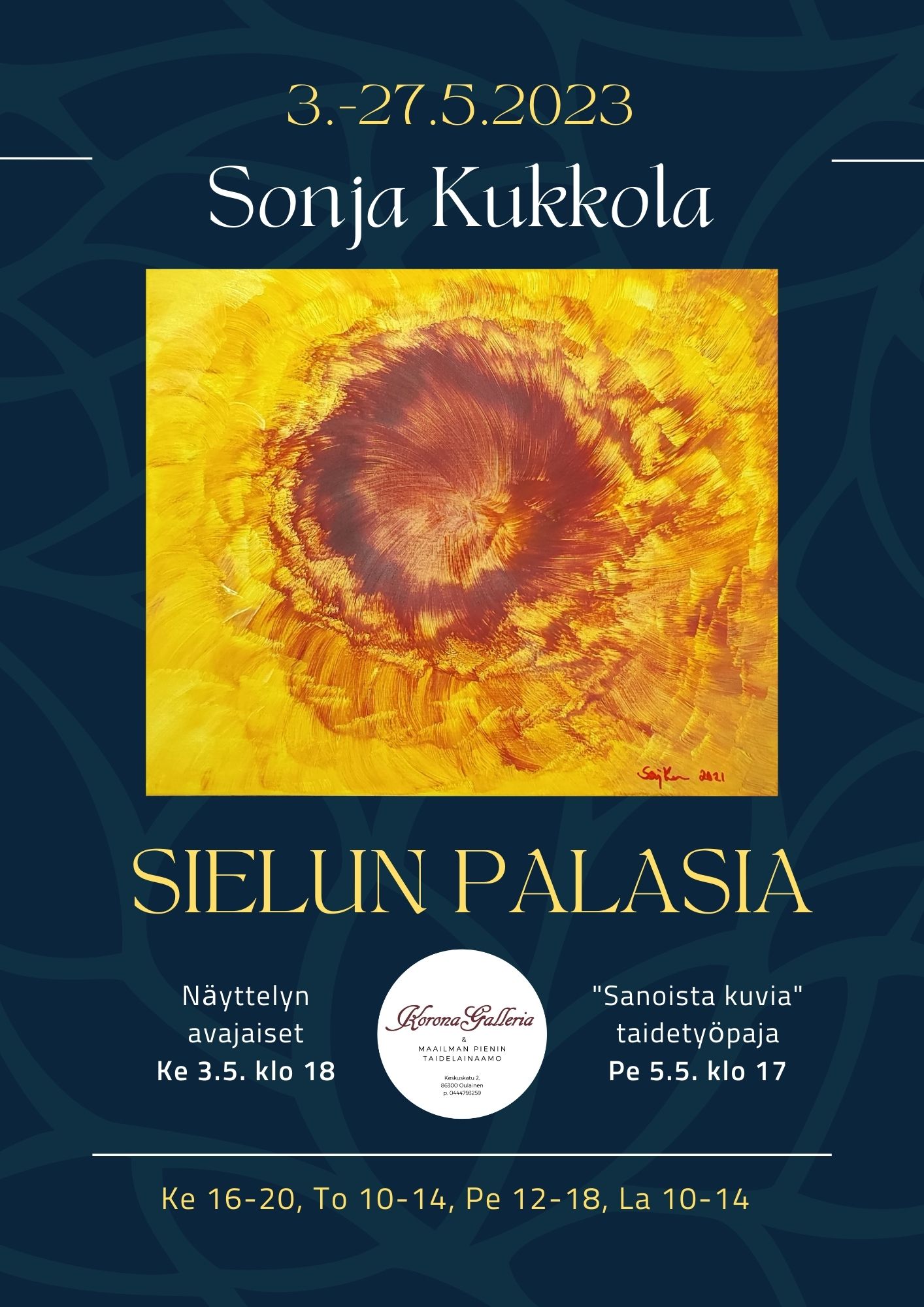Toukokuussa KoronaGalleriassa on esillä Sonja Kukkolan meditatiivista maalaustaidetta. Oulaistelaisen taiteen harrastajan värikylläisissä teoksissa erilaiset uskomukset ja onnea tuovat symbolit sekoittuvat abstrakteihin mielenmaisemiin.