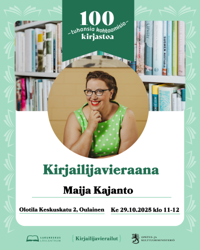 Tervetuloa viihtymään ja kuuntelemaan Maija Kajannon esitystä ja huomaathan, että kirjailijavieras poikkeuksellisesti kirjaston sijasta Oulaisten Olotilassa, Keskuskatu 2.