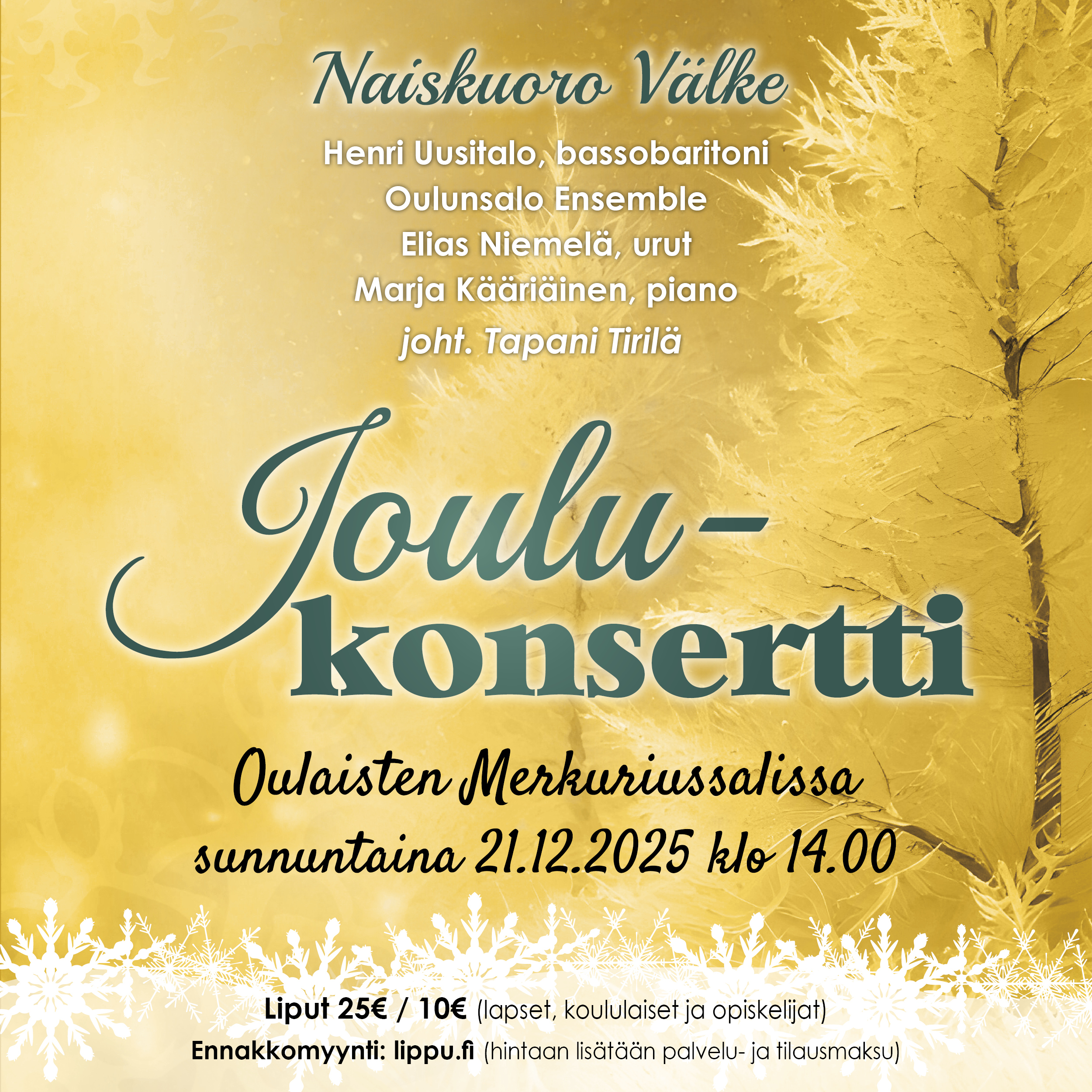 Yleisötapahtumat Su 21.12.2025 klo 14:00 Päättyy Su 21.12.2025 klo 16:00 Tapahtumapaikka Oulaisten Merkuriussali Joulukonsertti - Naiskuoro Välke Kosteenkatu 1 86300 Oulainen