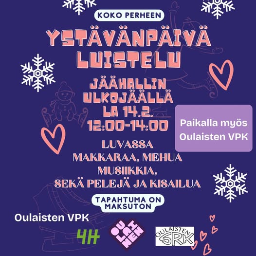 Perinteinen koko perheen ystävänpäiväluistelu jäähallin ulkojäällä lauantaina 14.2. klo 12-14 (huomaa aikainen aloitusajankohta!)
