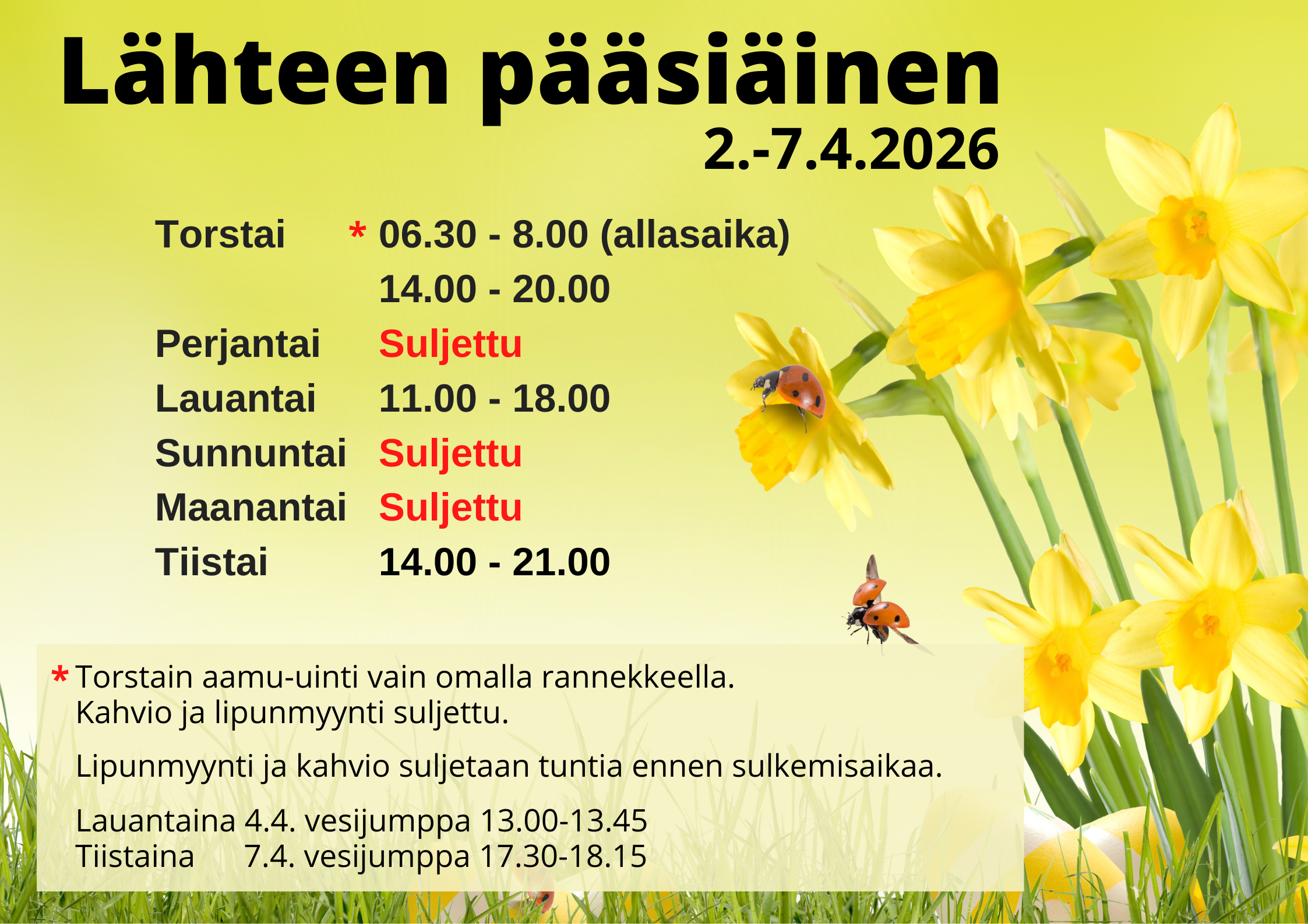 Lähteen kevään 2026 sunnuntaiaukioloajat 1.3. 22.3. ja 19.4. klo 12.00-17.00. Kahvio palvelee 17.00 asti. Lipunmyynti sulkeutuu tuntia ennen. Uintiaika päättyy puoli tuntia ennen sulkemisaikaa.